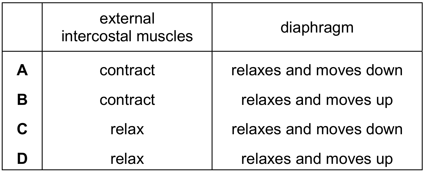 Expiration (breathing out) is a passive process that occurs when the muscles involved in inhalation relax. During expiration, the external intercostal muscles relax, causing the ribcage to move downwards and inwards. Simultaneously, the diaphragm relaxes and returns to its original dome-like shape, which means it moves up. These movements decrease the volume of the thoracic cavity and increase the air pressure inside the lungs relative to the atmosphere, forcing air out. Therefore, option D correctly describes both muscle actions.