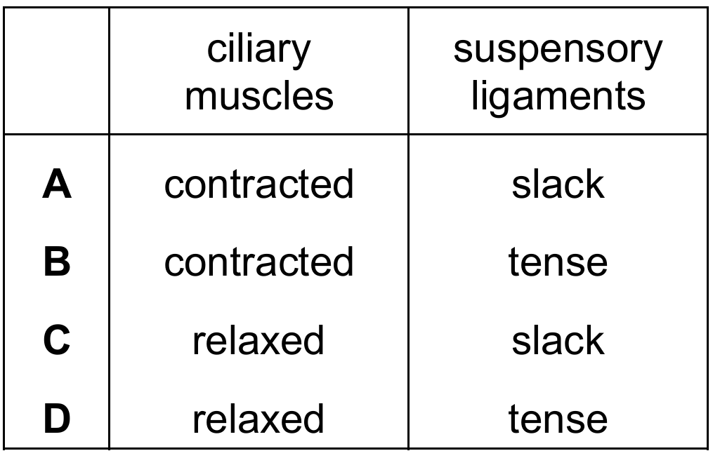 Which row shows the state of the ciliary muscles and suspensory ligaments when the eye is focusing on a near object?