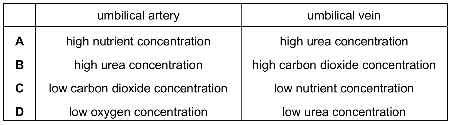 Which row shows the concentration of substances in the umbilical artery and umbilical vein?
