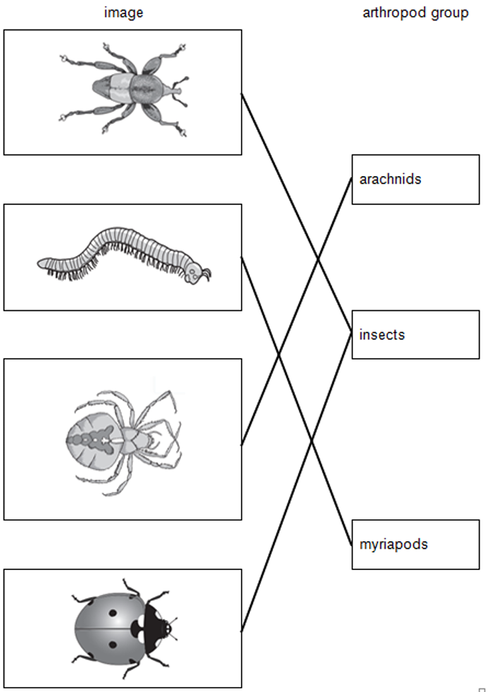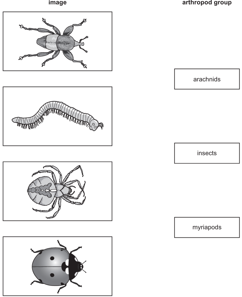 Draw a line from each box on the left to the box showing the correct arthropod group for the image.