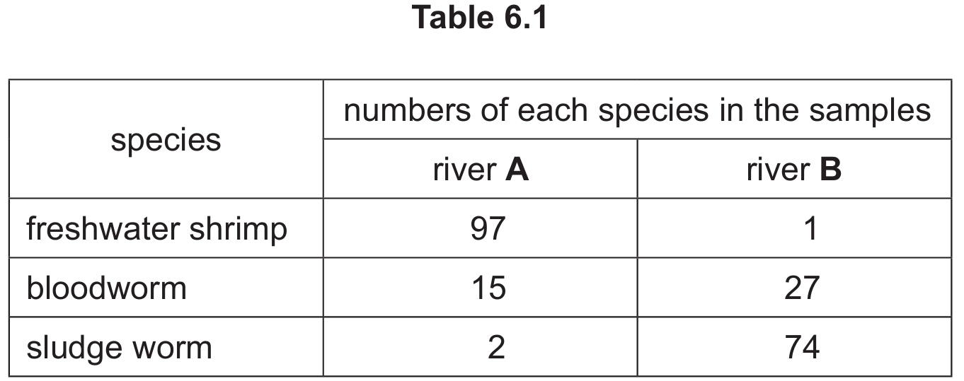 (b) Students investigated the populations of three species in two rivers, A and B. River B was contaminated with untreated sewage. The students took samples from the rivers, and counted the numbers of each species in each sample.