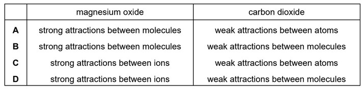 Which row identifies the attractive forces that are broken when these compounds are melted?