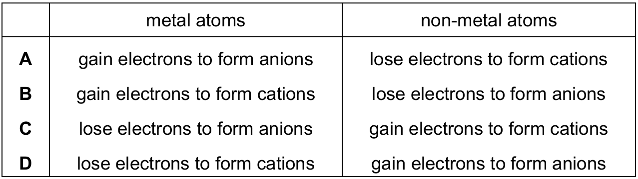 Option D correctly describes this behavior: metal atoms lose electrons to form cations, while non-metal atoms gain electrons to form anions. This is the fundamental principle behind ionic bonding.