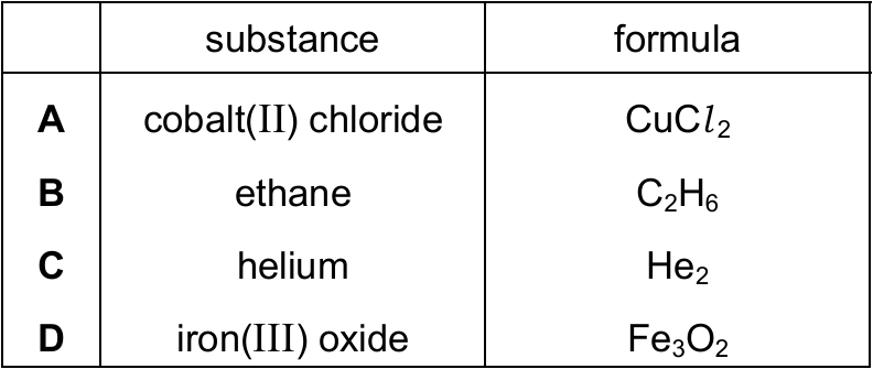 Therefore, only option B correctly matches the substance with its formula. Ethane (C₂H₆) is a hydrocarbon with single bonds between all atoms, following the general formula for alkanes (CₙH₂ₙ₊₂).