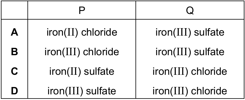 - Q must be iron(III) sulfate (Fe2(SO4)3) because it shows Fe3+ and SO42- characteristics