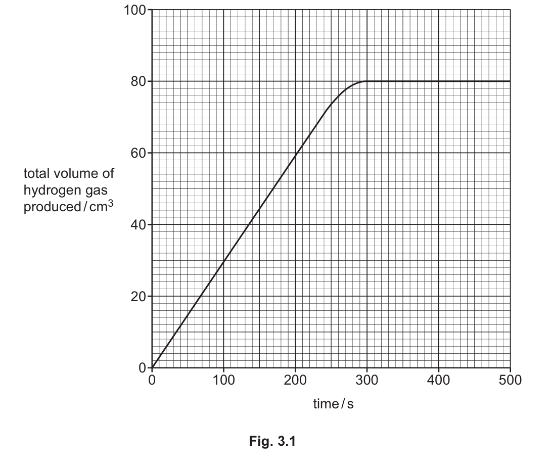 (iv) The experiment is repeated at a higher temperature. All other conditions stay the same. Draw a line on the grid in Fig. 3.1 to show how the volume of hydrogen gas produced changes at a higher temperature.