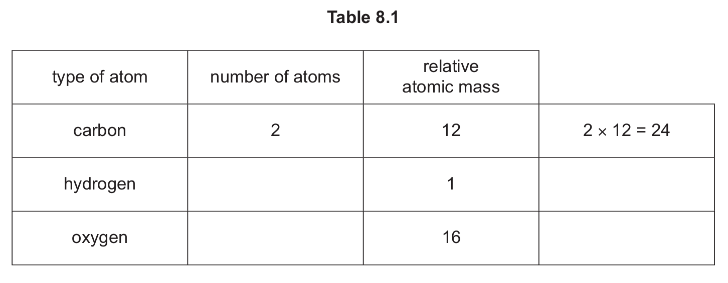 Complete Table 8.1 to calculate the relative molecular mass of \( CH_3COOH \).