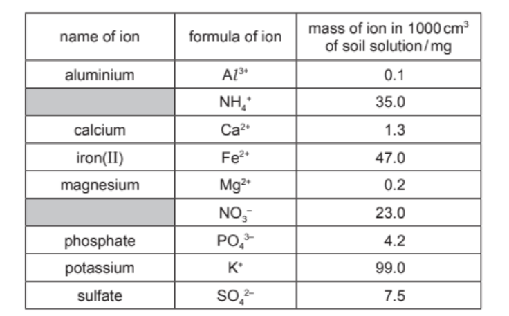 A solution is obtained by filtering a mixture of soil and water. The table shows the mass of some of the ions in $1000 \mathrm{~cm}^3$ of this solution.