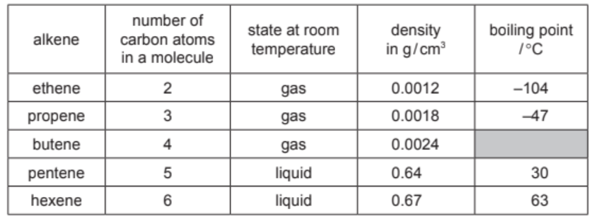 The properties of five alkenes at room temperature are shown in the table.