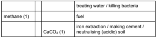(a) Complete the table to show the name, formula and use of each compound and element.