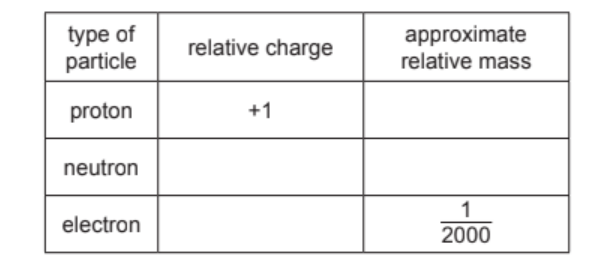 (b) Complete the table to show the relative charge and approximate relative mass of a proton, a neutron and an electron.