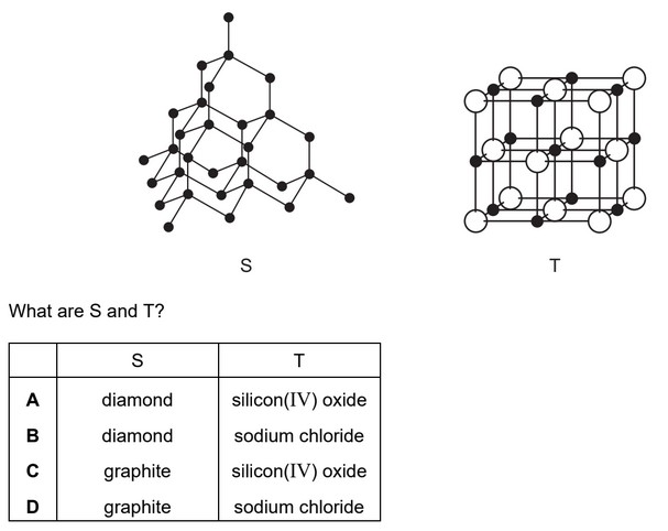 The arrangement of particles in each of two solids, S and T, are shown.