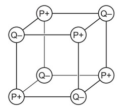 P and Q react together to form an ionic compound. Part of the lattice of this compound is shown.