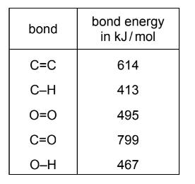 Ethene gas, \(\mathrm{C}_2 \mathrm{H}_4\), is completely burned in excess oxygen to form carbon dioxide and water.