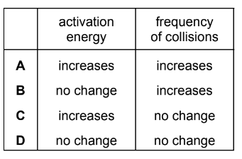 Which row describes the effect on the activation energy and the frequency of particle collisions when the temperature of a chemical reaction is increased?