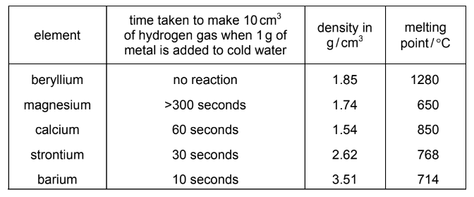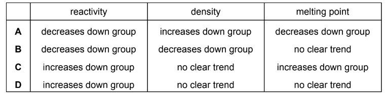Which row shows the correct trends in reactivity, density and melting point of the elements going down Group II of the Periodic Table?