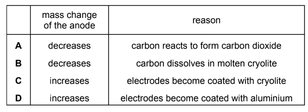 During the electrolysis of aluminium oxide, the mass of the carbon anode changes.