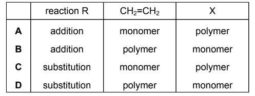 Which terms describe reaction \(\mathrm{R}, \mathrm{CH}_2=\mathrm{CH}_2\) and \(\mathrm{X}\) ?