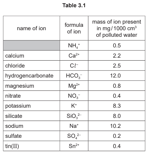 (c) Table 3.1 shows the masses of ions, in \(\mathrm{mg}\), present in a \(1000 \mathrm{~cm}^3\) sample of polluted water.