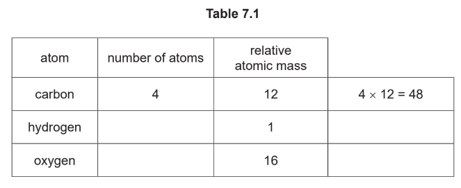 Complete Table 7.1 to calculate the relative molecular mass of \(\mathrm{C}_4 \mathrm{H}_8 \mathrm{O}_2\).
