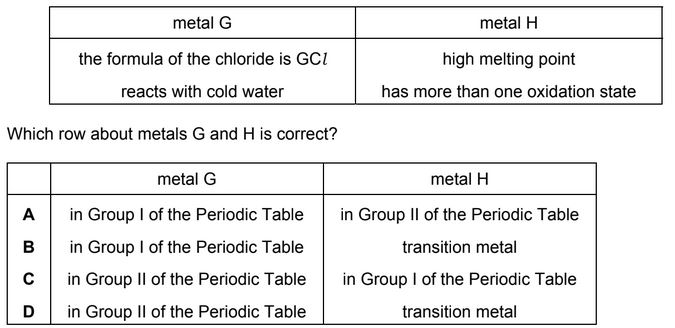 Some properties of two metals, G and H, are shown.