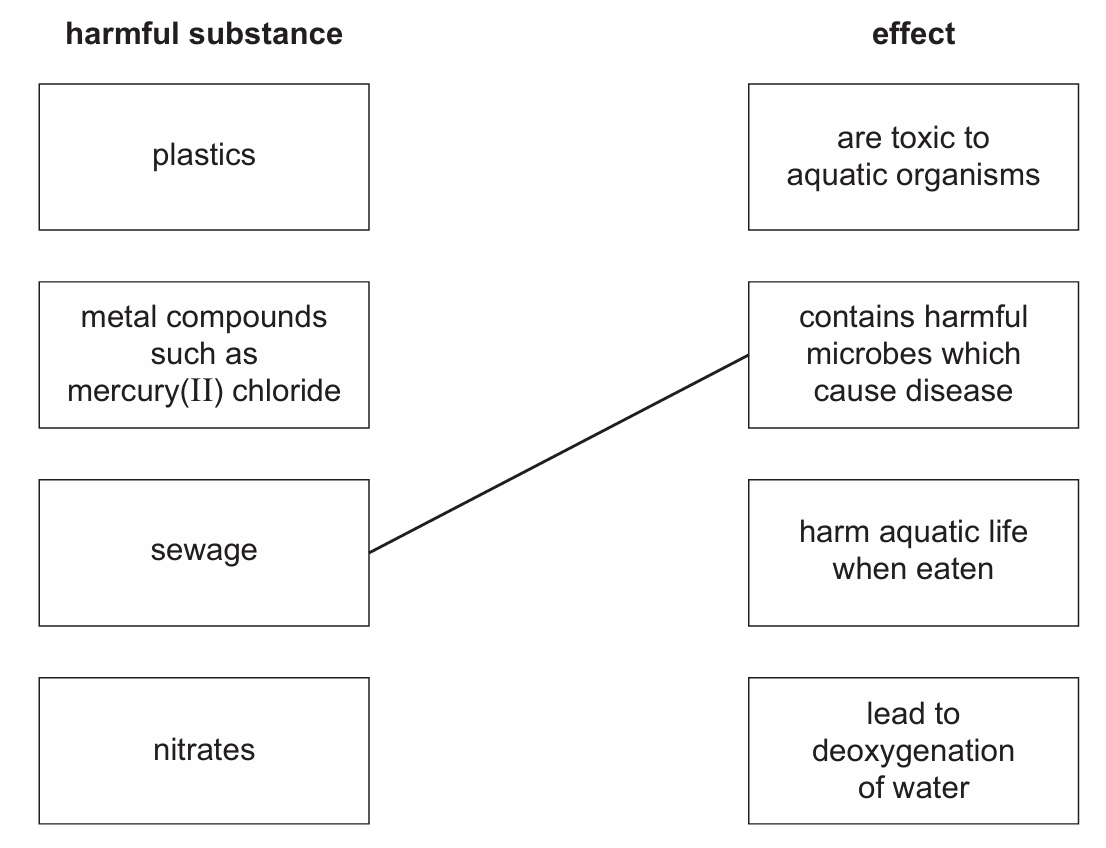 (b) Polluted water contains harmful substances. Link each harmful substance on the left to the correct effect on the right. One has been done for you.