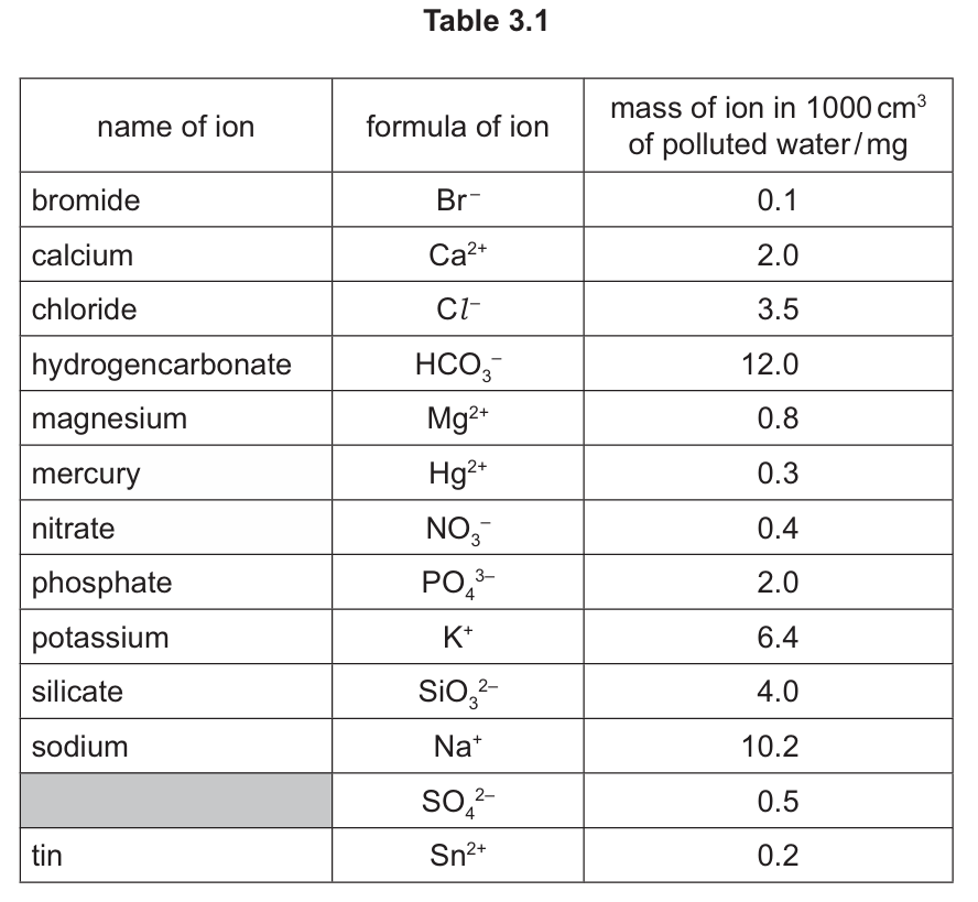 (c) Table 3.1 shows the masses of ions, in mg, present in a 1000 cm3 sample of polluted water.