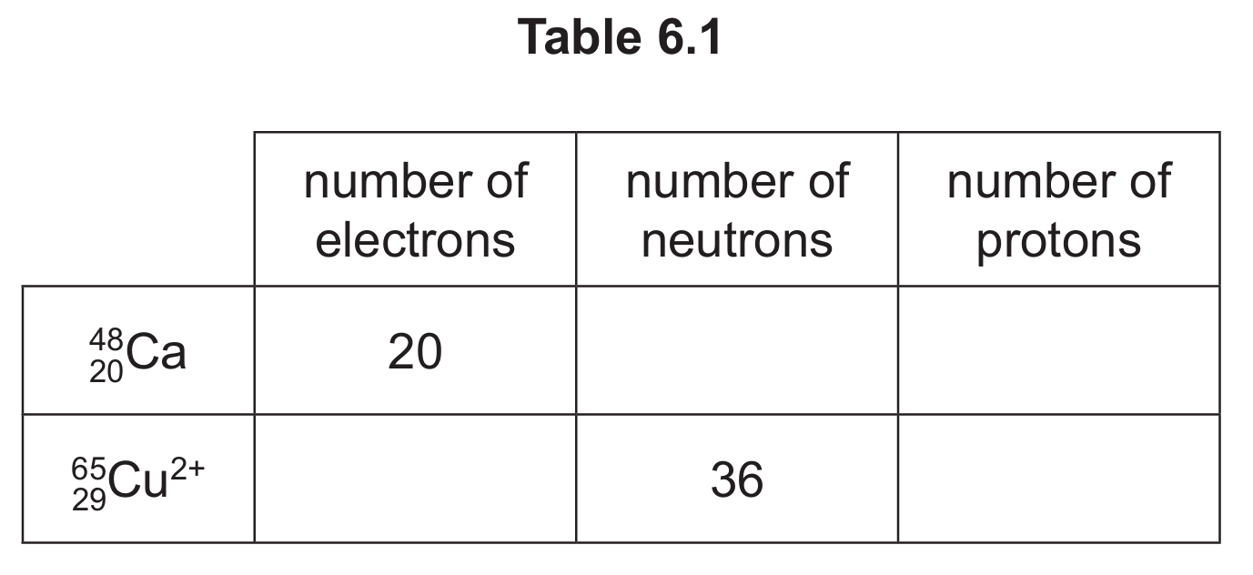(b) (i) Complete Table 6.1 to show the number of electrons, neutrons and protons in the calcium atom and copper ion shown.