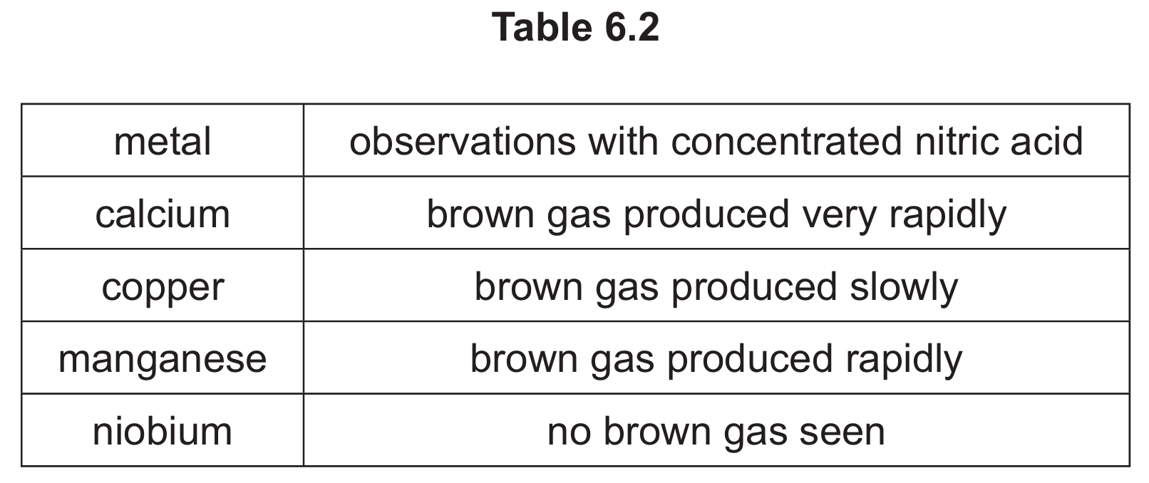 (d) Table 6.2 shows the observations when four different metals react with concentrated nitric acid.