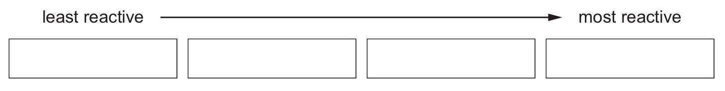 The reactivity order is determined by the rate of brown gas (NO2) production: no gas (least reactive) → slow production → rapid production → very rapid production (most reactive).