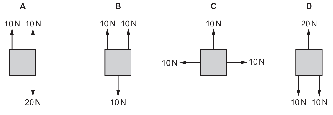 The diagrams show four identical objects. Each object is acted on by only the forces shown.