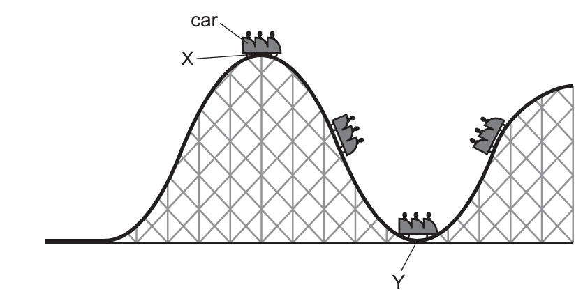 The diagram shows part of a rollercoaster ride with the car at different positions.