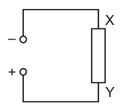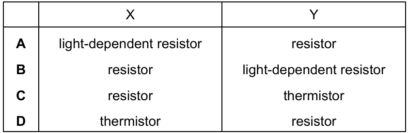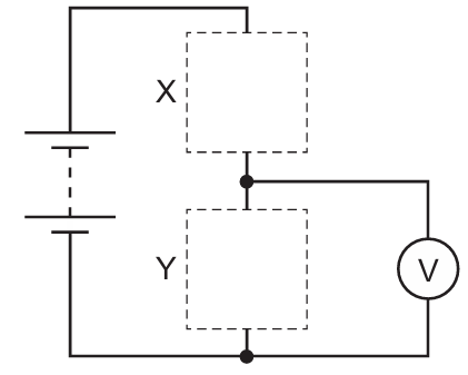 The circuit shown can be completed by inserting components at X and at Y. The completed circuit is a potential divider in which the potential difference across component Y increases when the temperature increases.