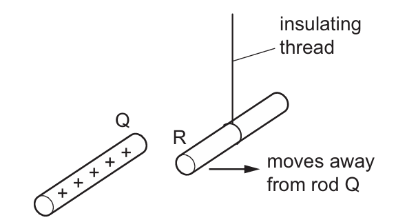 When the positively charged rod Q is brought close to rod R, rod R moves away from rod Q.
