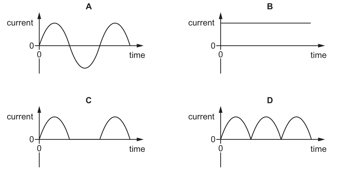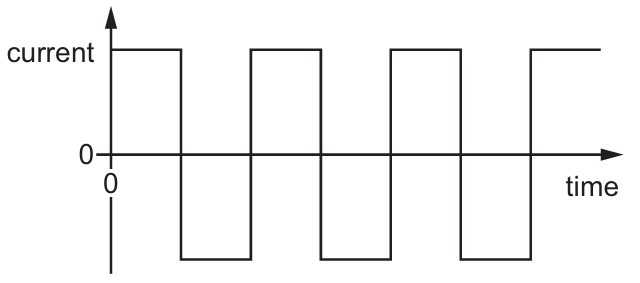 The current in the wire repeatedly changes between a constant value in one direction and a constant value in the opposite direction, as shown in the graph.