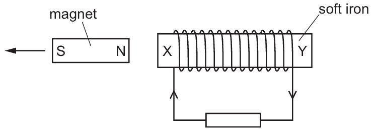 The N pole of a bar magnet is pulled away from end X which causes an induced current in the coil.