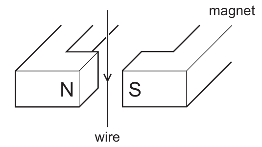 The diagram shows a wire in the magnetic field between two poles of a magnet.