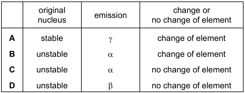 Which row correctly describes an example of radioactive decay?
