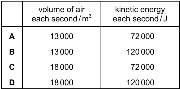 Which row gives the volume of the air hitting the blades each second and the kinetic energy of the air hitting the blades each second?
