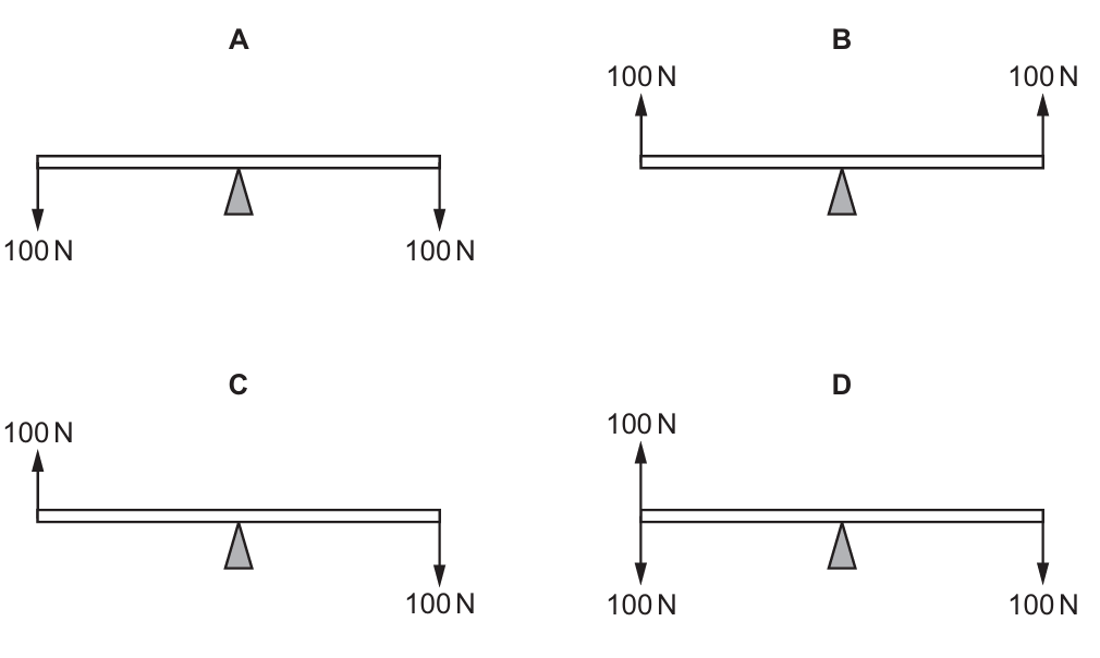 A uniform rod rests on a pivot at its centre. The rod is not attached to the pivot. Forces are then applied to the rod in four different ways, as shown. The weight of the rod can be ignored.