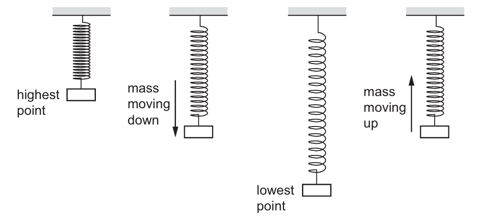 A mass bounces up and down on a steel spring. The diagram shows the mass and the spring at different points during the motion.