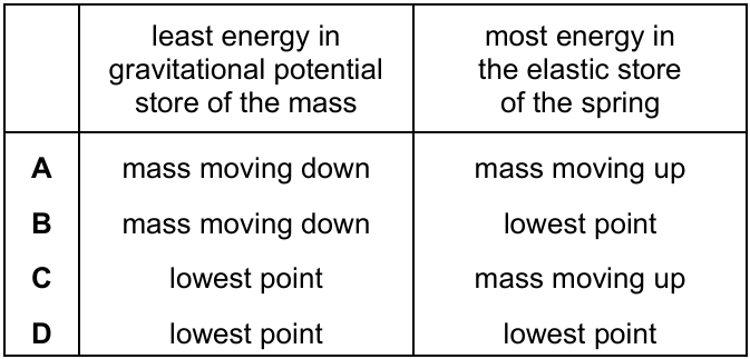 At which point is the least energy in the gravitational potential store of the mass and at which point is the most energy in the elastic store of the spring?