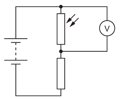 The diagram shows a light-dependent resistor (LDR) connected in a potential divider circuit.