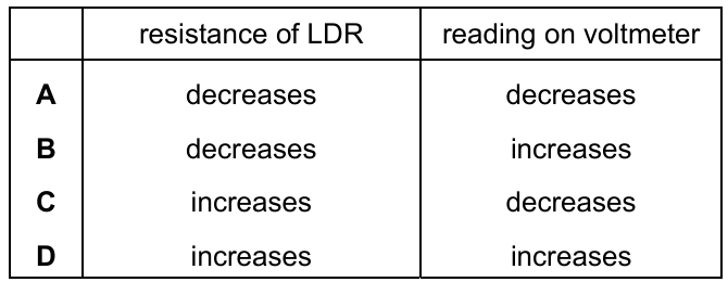 Which row shows what happens to the resistance of the LDR and what happens to the reading on the voltmeter?