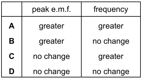 What happens to the peak electromotive force (e.m.f.) and to the frequency of the a.c. output when the coil is rotated faster?