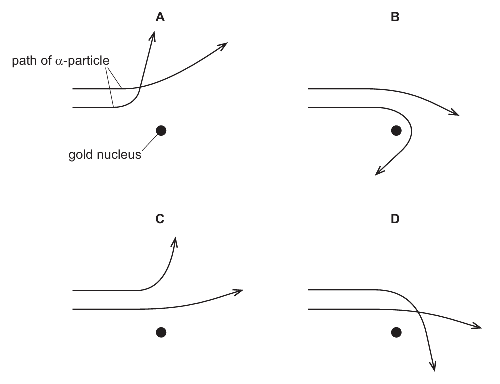 Which diagram shows the correct paths followed by the α-particles as they pass close to the nucleus?