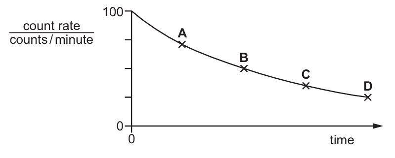An object containing carbon-14 has a count rate of 100 counts / minute when it is first formed. The graph shows how the count rate decreases over time.