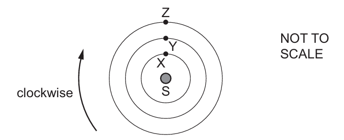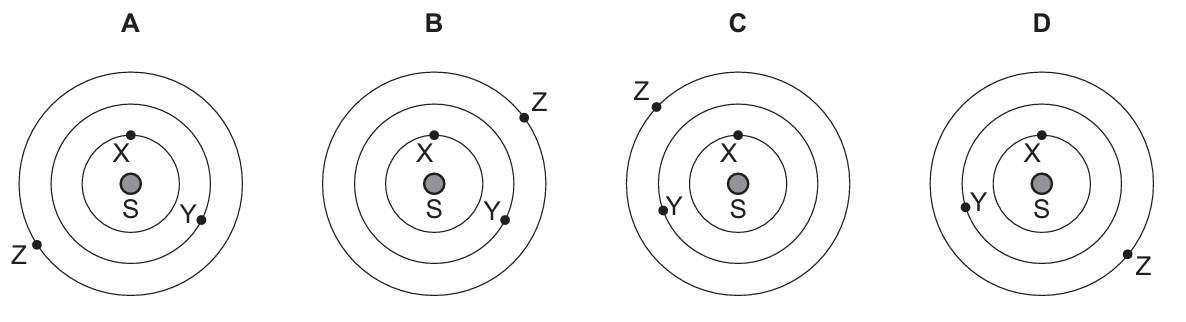 The diagram shows a star S and the initial arrangement of three planets, X, Y and Z.