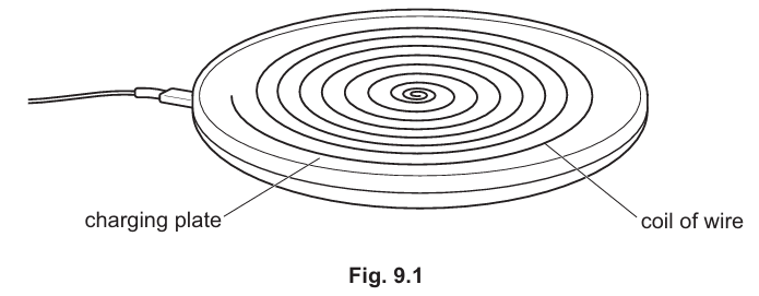 (b) A mobile phone is placed on the charging plate as shown in Fig. 9.2. The coil in the mobile phone is part of a separate circuit that charges the battery.