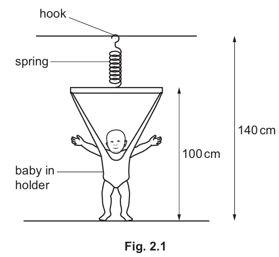 (b) Fig. 2.1 shows a baby in a baby bouncer. The baby bouncer consists of a holder suspended from a spring. The baby pushes his feet on the ground and bounces gently up and down.